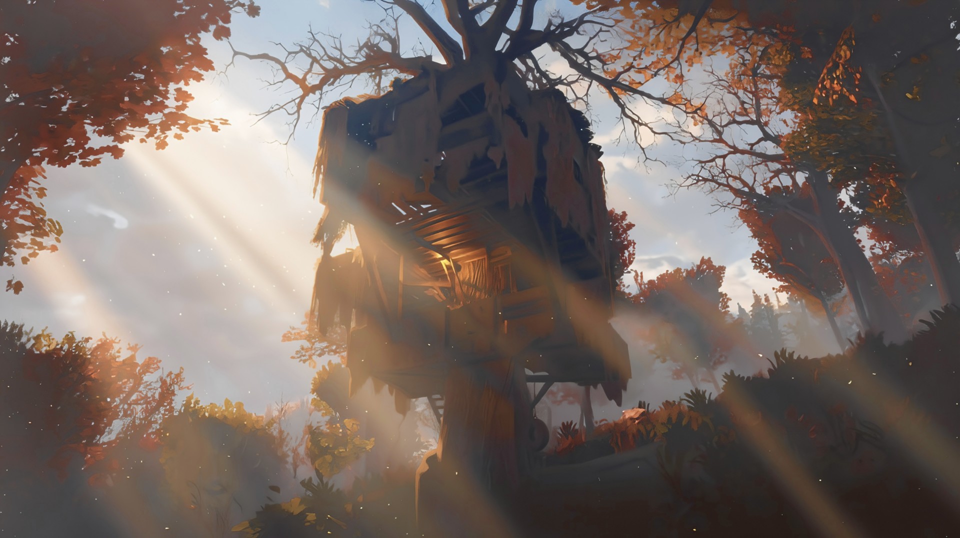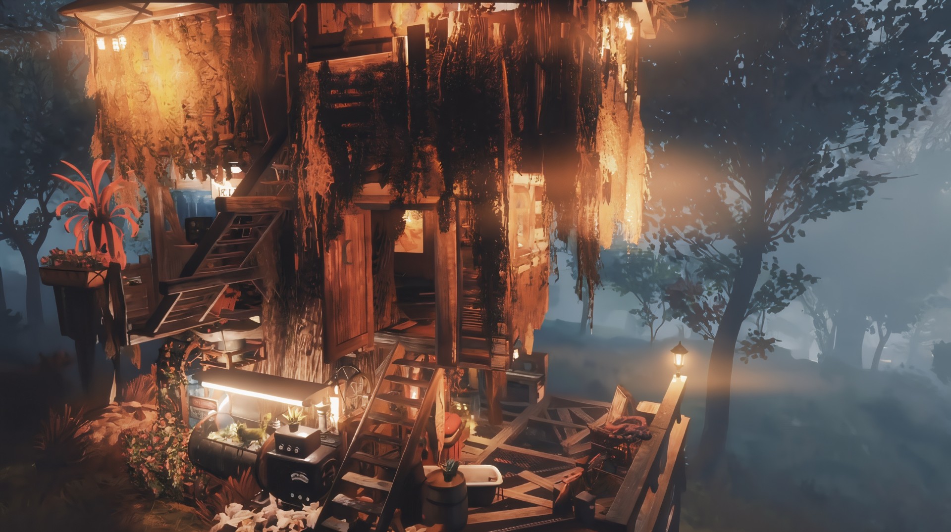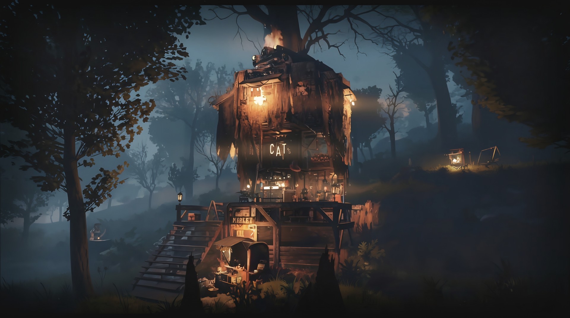 Out in the tangled woods of Skyline Valley, where the wind whistles through broken branches and the old world feels like a half-remembered dream, there stands a tree. Not just any tree, mind you—but the kind of towering, stubborn tree that looks like it survived the bombs out of pure spite. A tree that holds a house. A house patched together with scavenged boards, mismatched windows, humming wires, and more personality than good sense. A house that holds Deviant Cat.