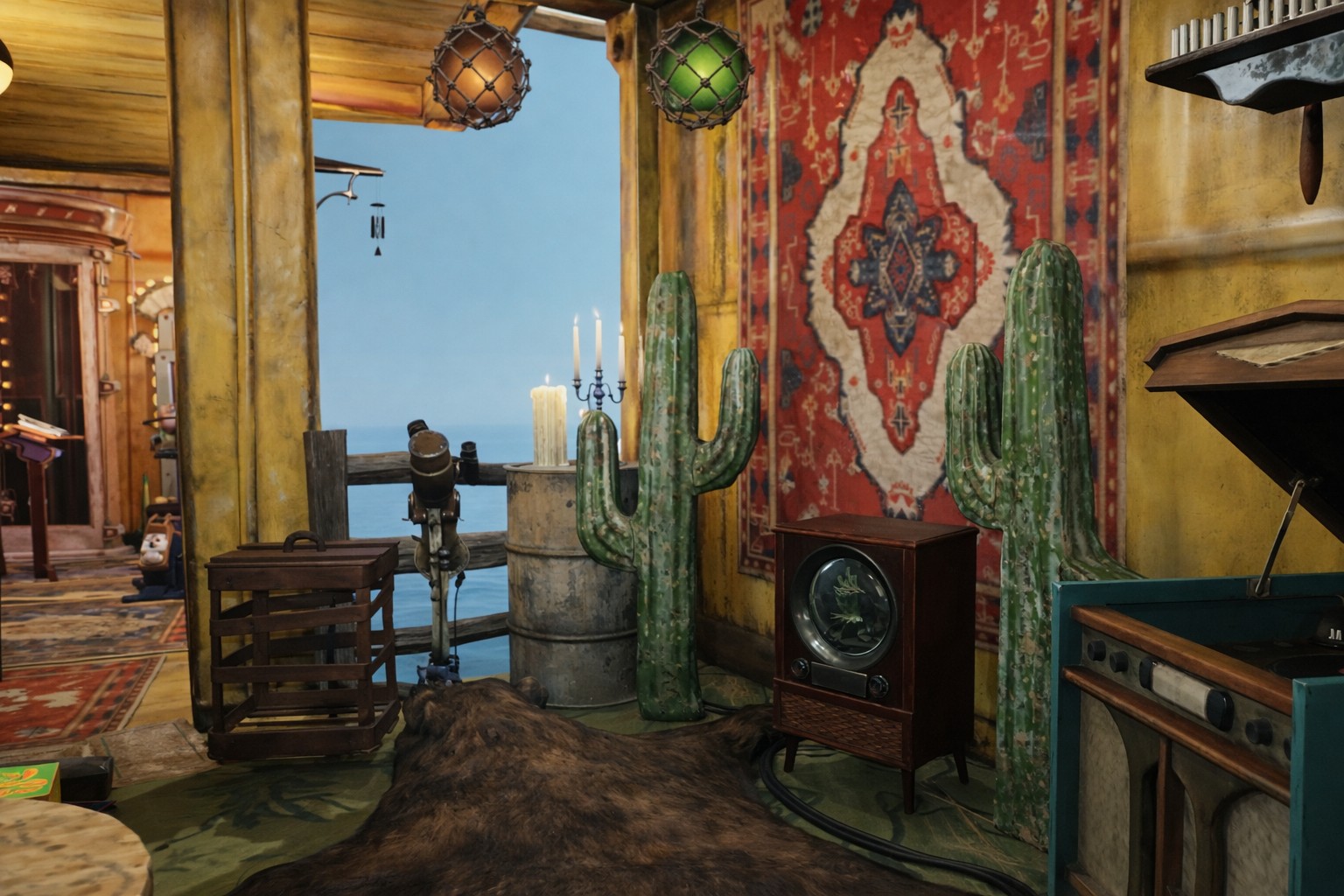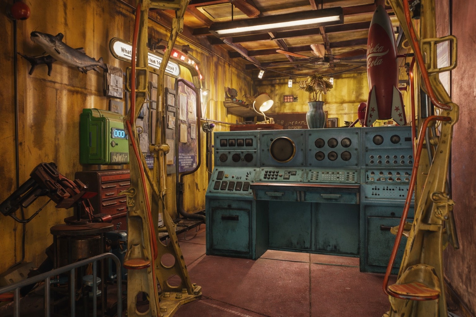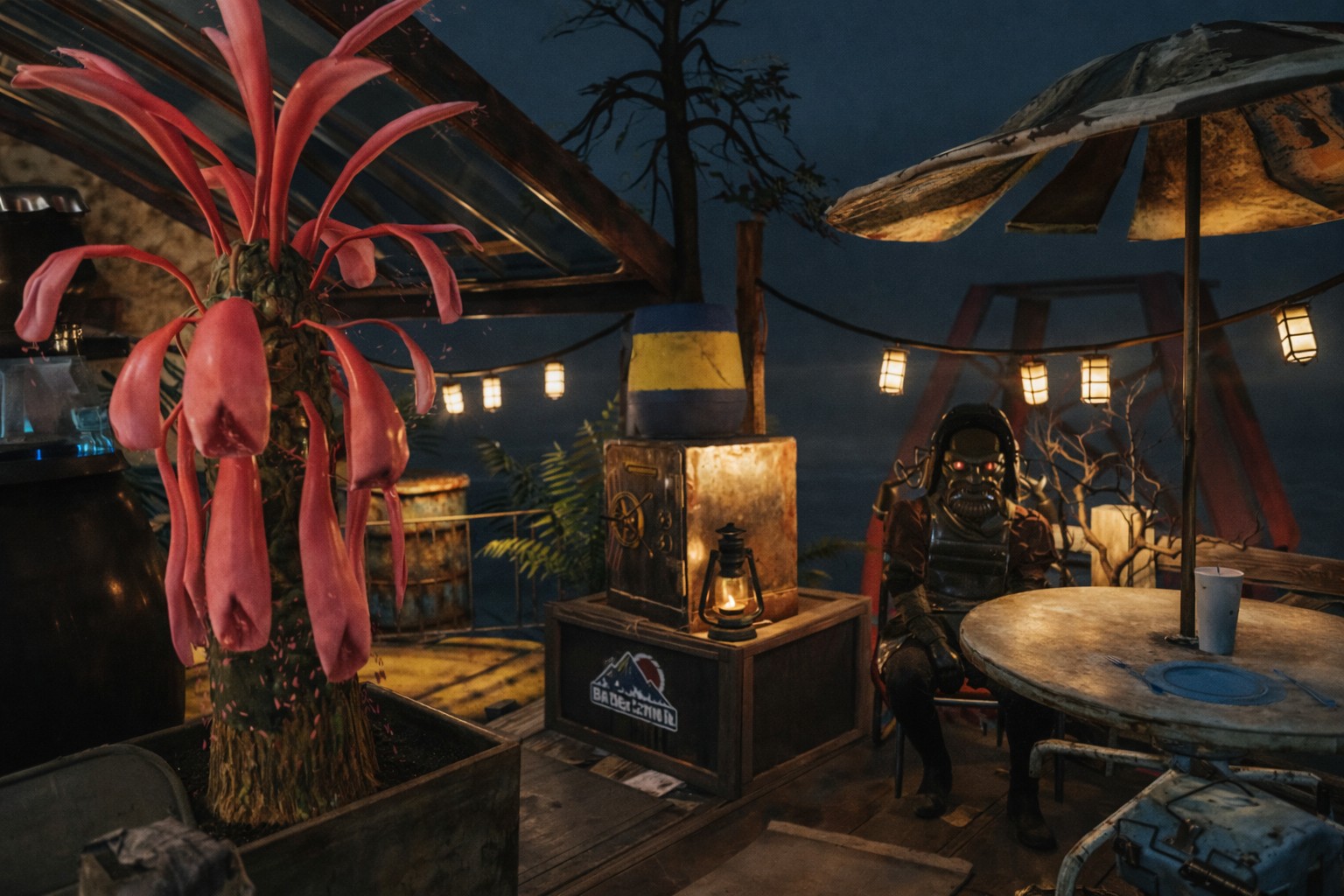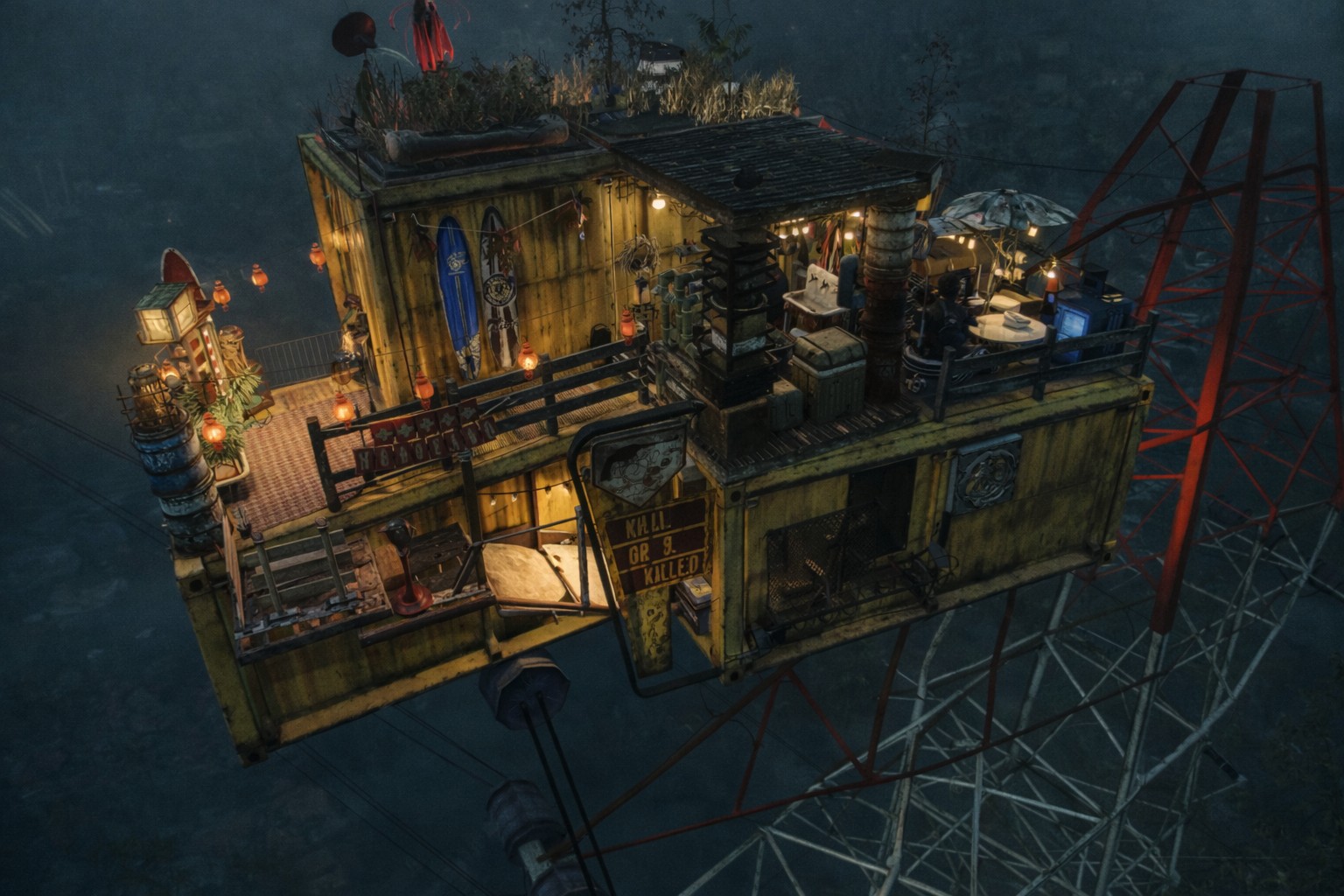 Built from weathered yellow shipping containers, patched sheet metal, and whatever bits of scrap could be scavenged from the wasteland, the place looks as though it was assembled piece by piece by someone who refused to let gravity get in the way. One would practically need a vertibird to haul all that steel and junk up here to the tip of the tower. Of course, others swear it must have been done with something stranger… perhaps a sleigh drifting quietly through the night sky… or maybe even a spaceship lowering its cargo from the clouds. But that’s your theory to decide—if you can manage to climb high enough to see it for yourself.